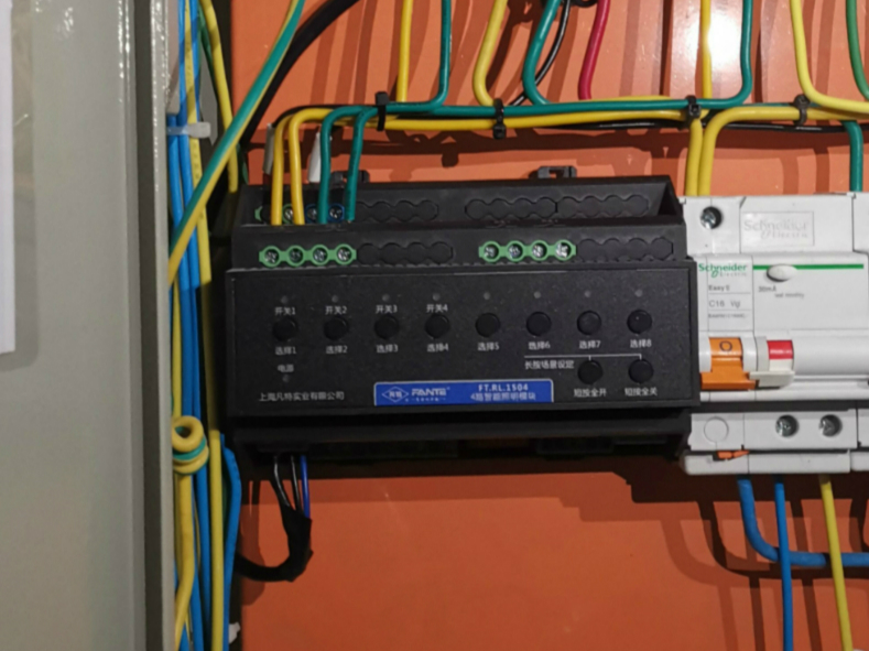 該智能照明控制系統(tǒng)項目采用的是經(jīng)濟型4路、8路智能照明模塊以及485有源集線器,均安裝在電箱內(nèi),導軌安裝。