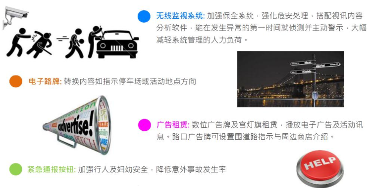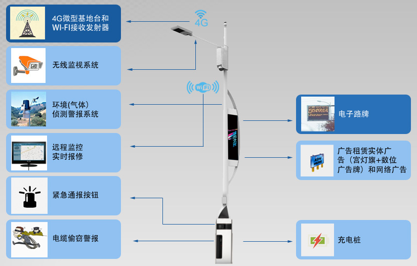 智慧路燈桿是一種集成各種信息設備技術創(chuàng)新復合應用的智慧路燈產(chǎn)品,整個智慧燈桿內(nèi)包含路燈照明控制系統(tǒng)、WIFI天線基站、視頻監(jiān)控管理、廣告屏播控系統(tǒng)、城市環(huán)境實時監(jiān)測、緊急呼叫系統(tǒng)、水位監(jiān)測、充電樁系統(tǒng)和井蓋監(jiān)測系統(tǒng)等應用。