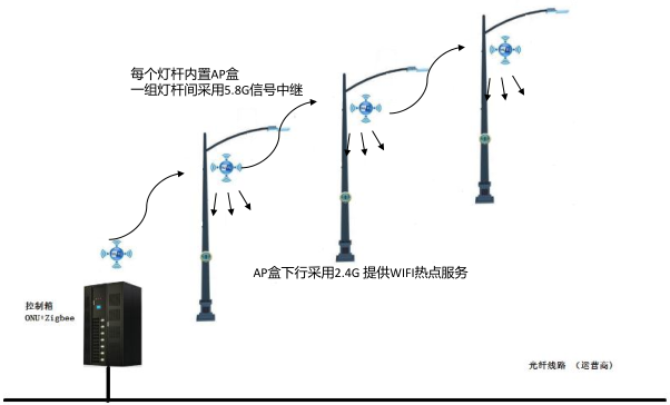 采用運營商光纖網(wǎng)絡比無線4G更加穩(wěn)定,在不具備部署光纖的區(qū)域,可以使用4G微基站。采用5.8G信號在燈桿間做Mesh,同時提供下行2.4G頻段作為AP上網(wǎng)使用。